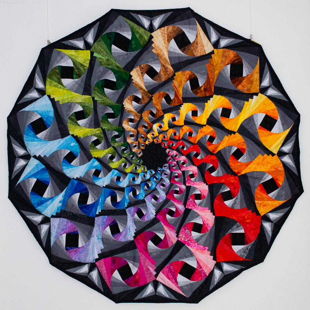 2023. Het middenstuk is een paneltje, gekocht in Amerika. Ik vond het zo mooi dat ik er een quiltje omheen gemaakt heb. Blik in de verte.